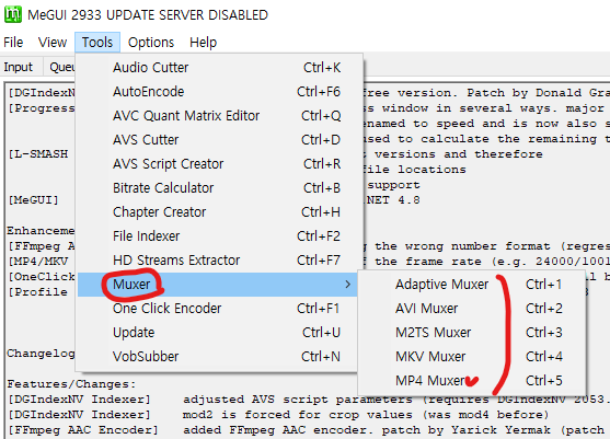Muxer를 클릭, 원하는 메뉴를 클릭한다.