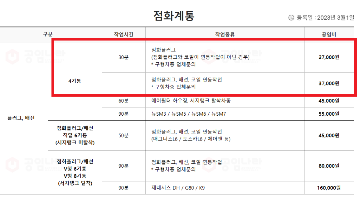 공임나라의 표준공임을 보니, 점화플러그, 배선, 코일 교환 공임이 37,000원으로 나와 있다.