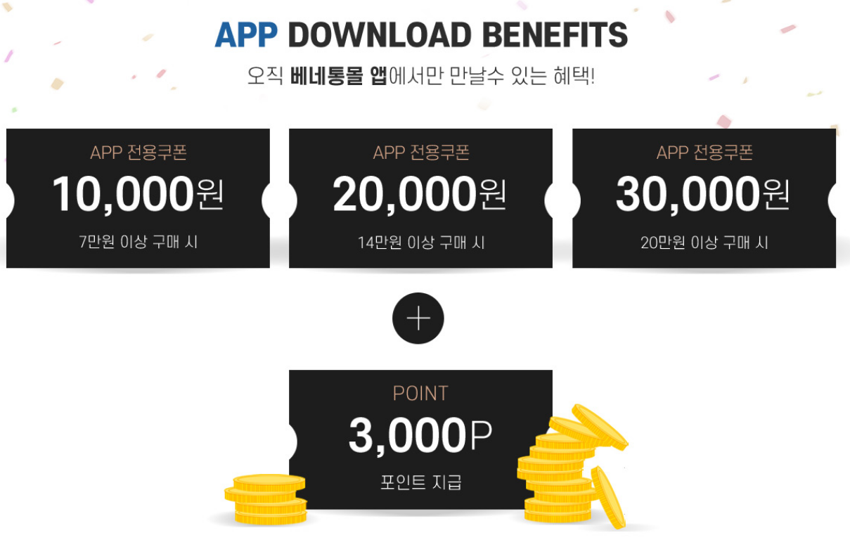 또 베네통몰 앱을 신규로 받으면 여러가지 쿠폰과 포인트를 준다.