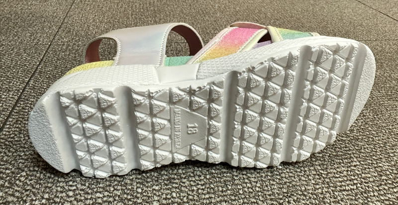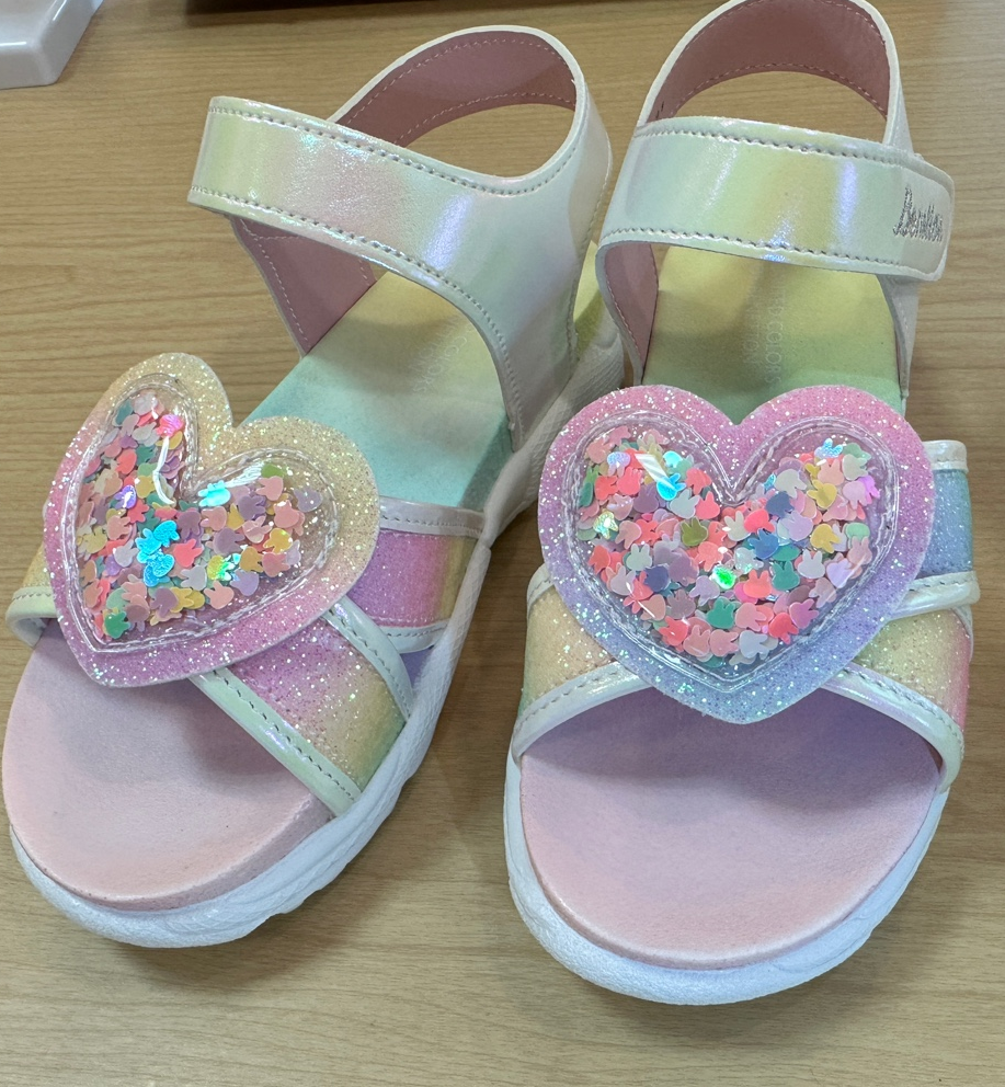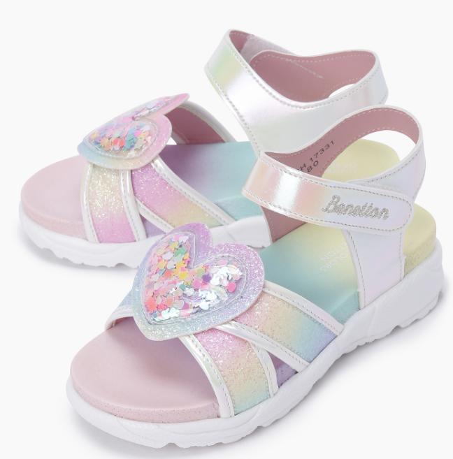 파스텔톤+핑크에 하트 스팽글이 달린 샌들.