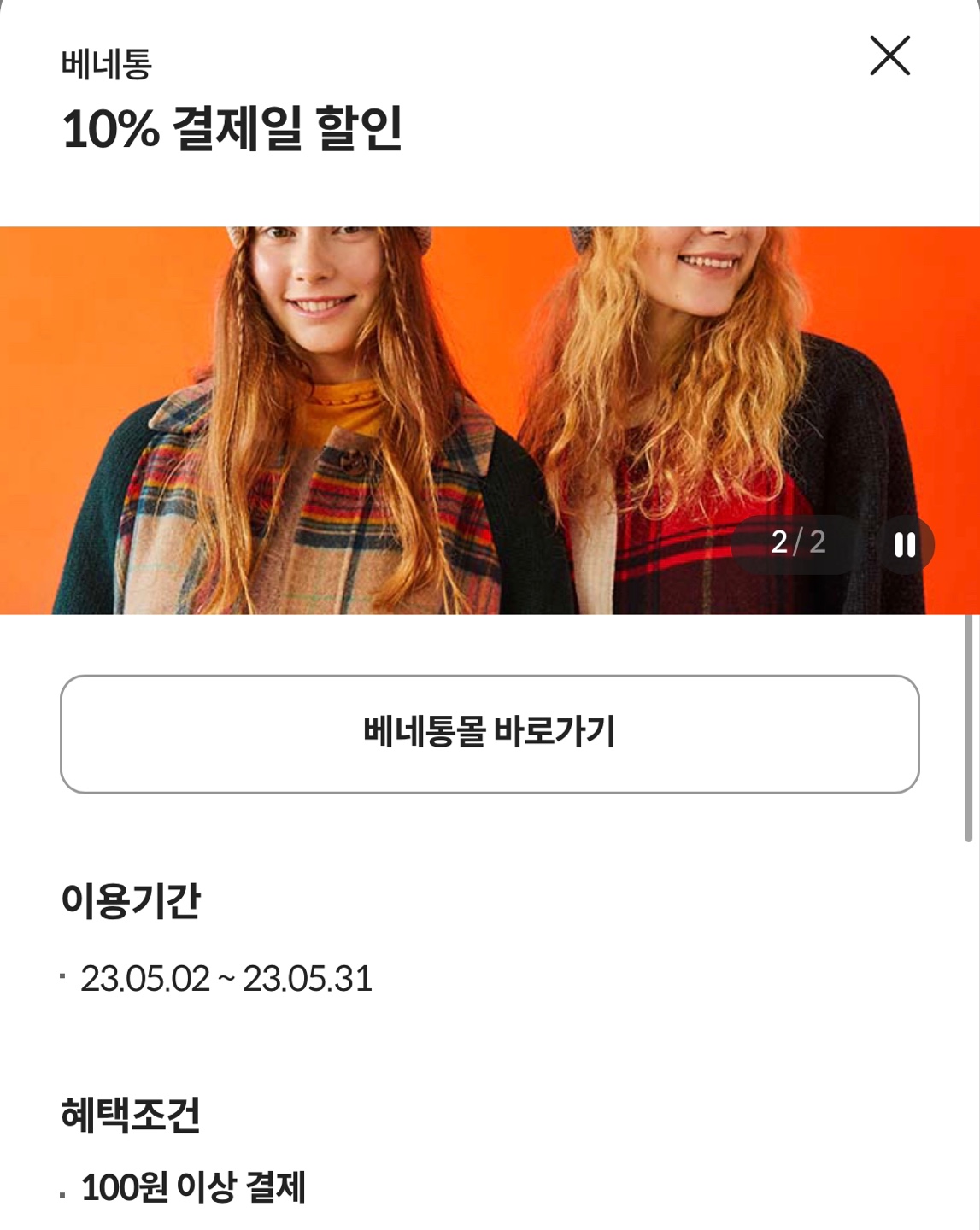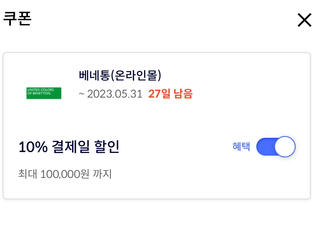 신한카드 마이샵, 삼성카드 링크(LINK), 롯데카드 터치(TOUCH)에 베네통몰 할인이 있었다.