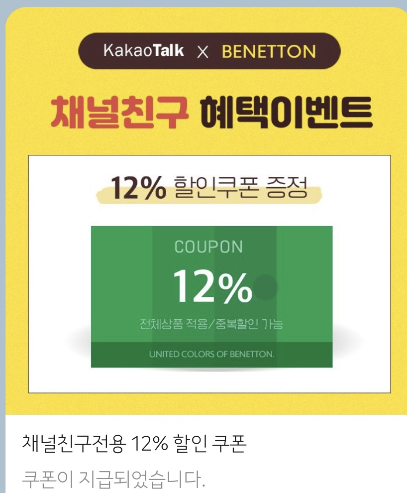 카카오톡 채널 친구 추가를 하면 12% 할인 쿠폰을 준다.