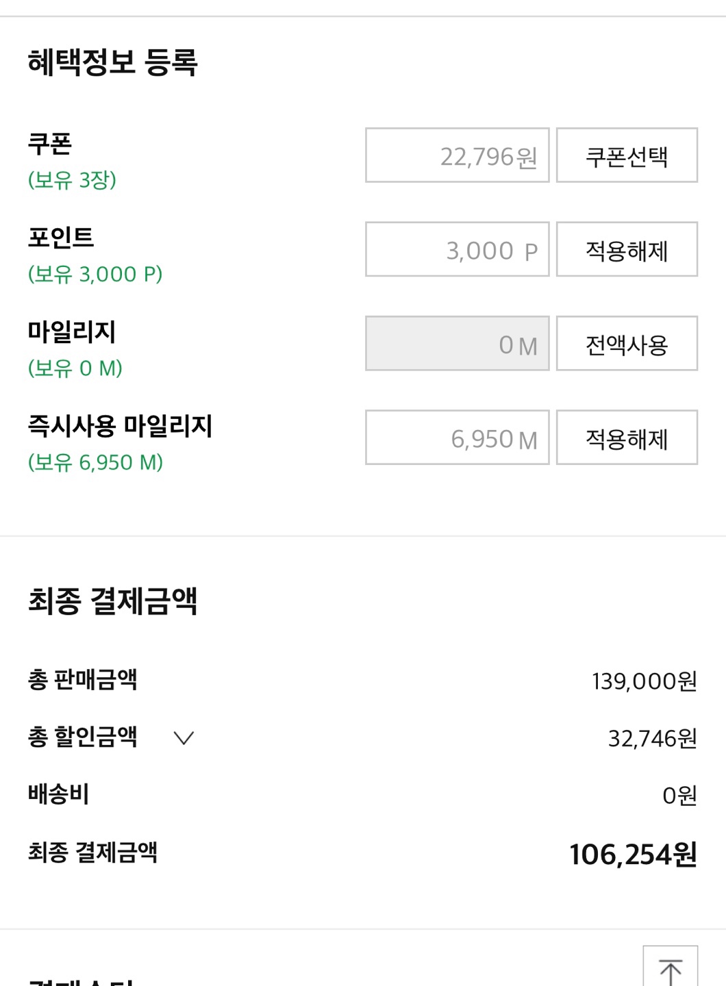기본 쿠폰 + 12% 할인 + 3000P사용 + 6950M 사용 해서 106,254원을 신한카드로 결제했다.