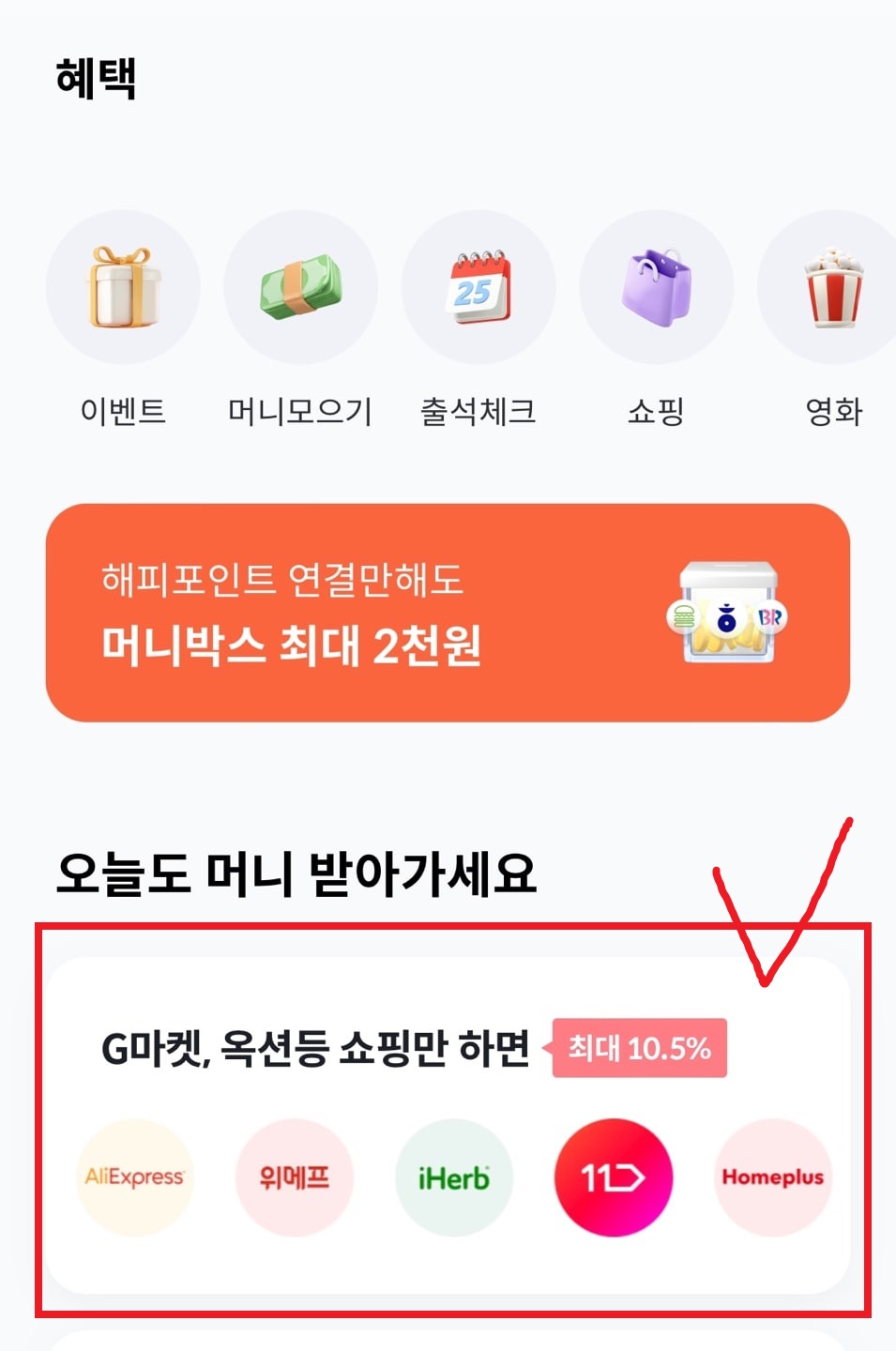 G마켓, 옥션등 쇼핑만 하면 최대 10.5% 라는 배너가 있다.