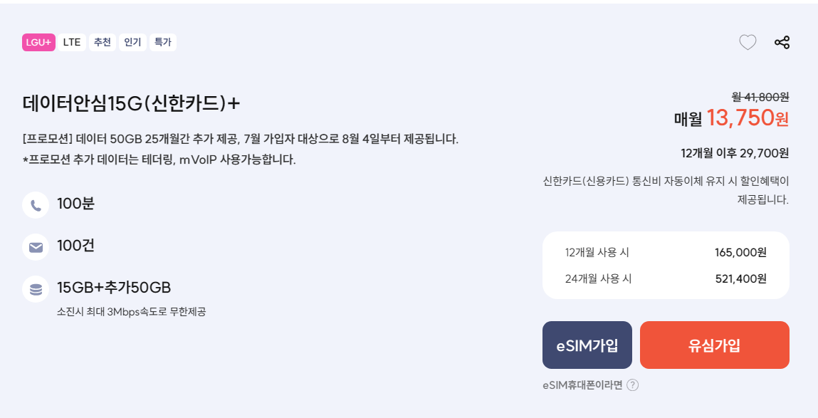 프리티텔레콤의 데이터안심15G(신한카드)+ 요금제가 눈에 들어왔다.