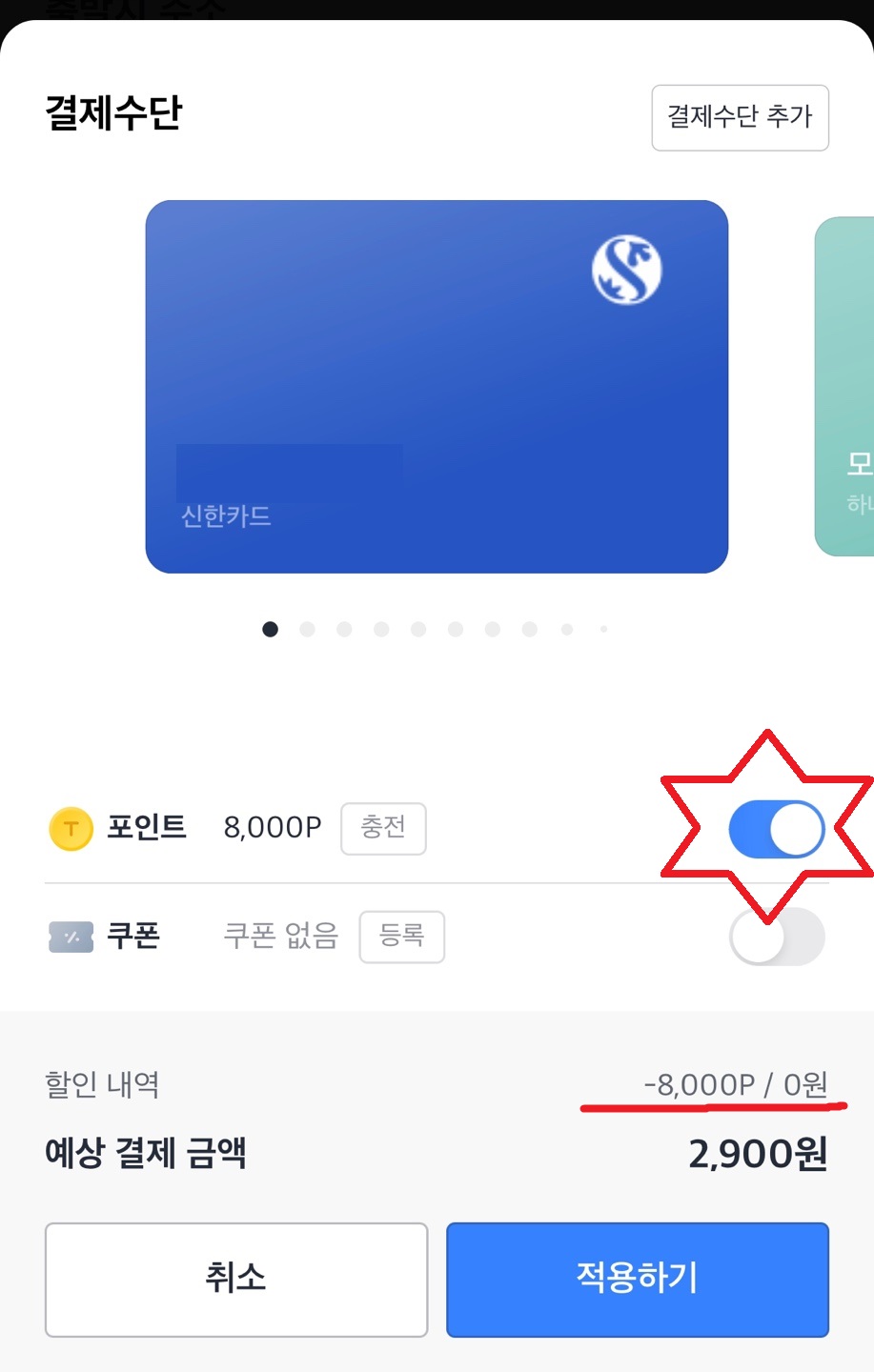 따라서 포인트를 사용하고 싶으면 결제카드 선택후 아래의 포인트 메뉴에서 버튼을 활성화 해야 한다.