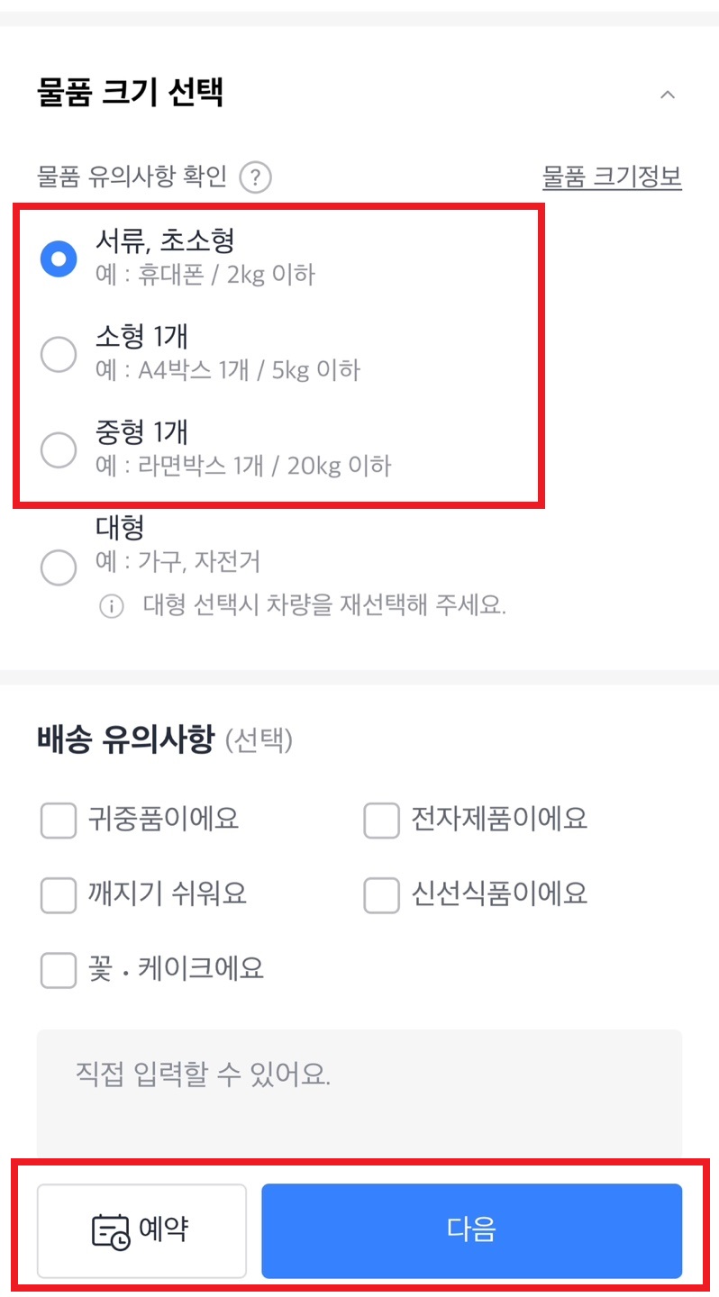 물품 크기를 선택한다.