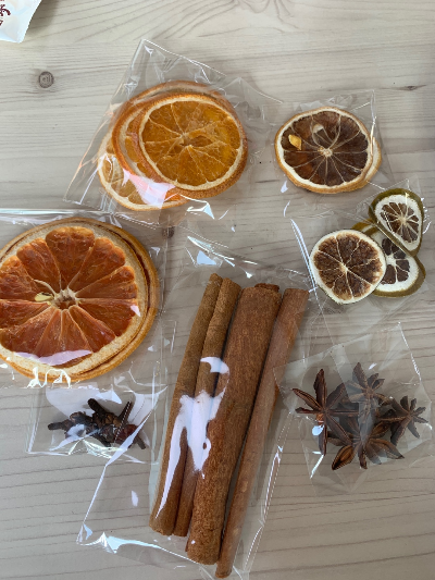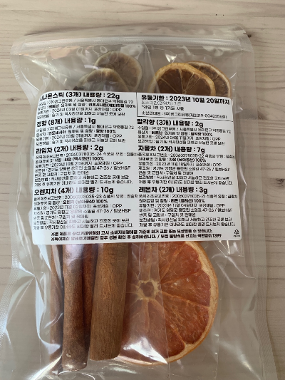 재료를 꺼내어 보니, 4가지 시트러스류와 시나몬, 팔각, 정향으로 구성되어 있다. 과일은 라임, 오렌지, 자몽, 레몬이 들어있는데 다른 레시피에는 이런 귤 종류 외에 사과를 넣기도 하는 것 같다.