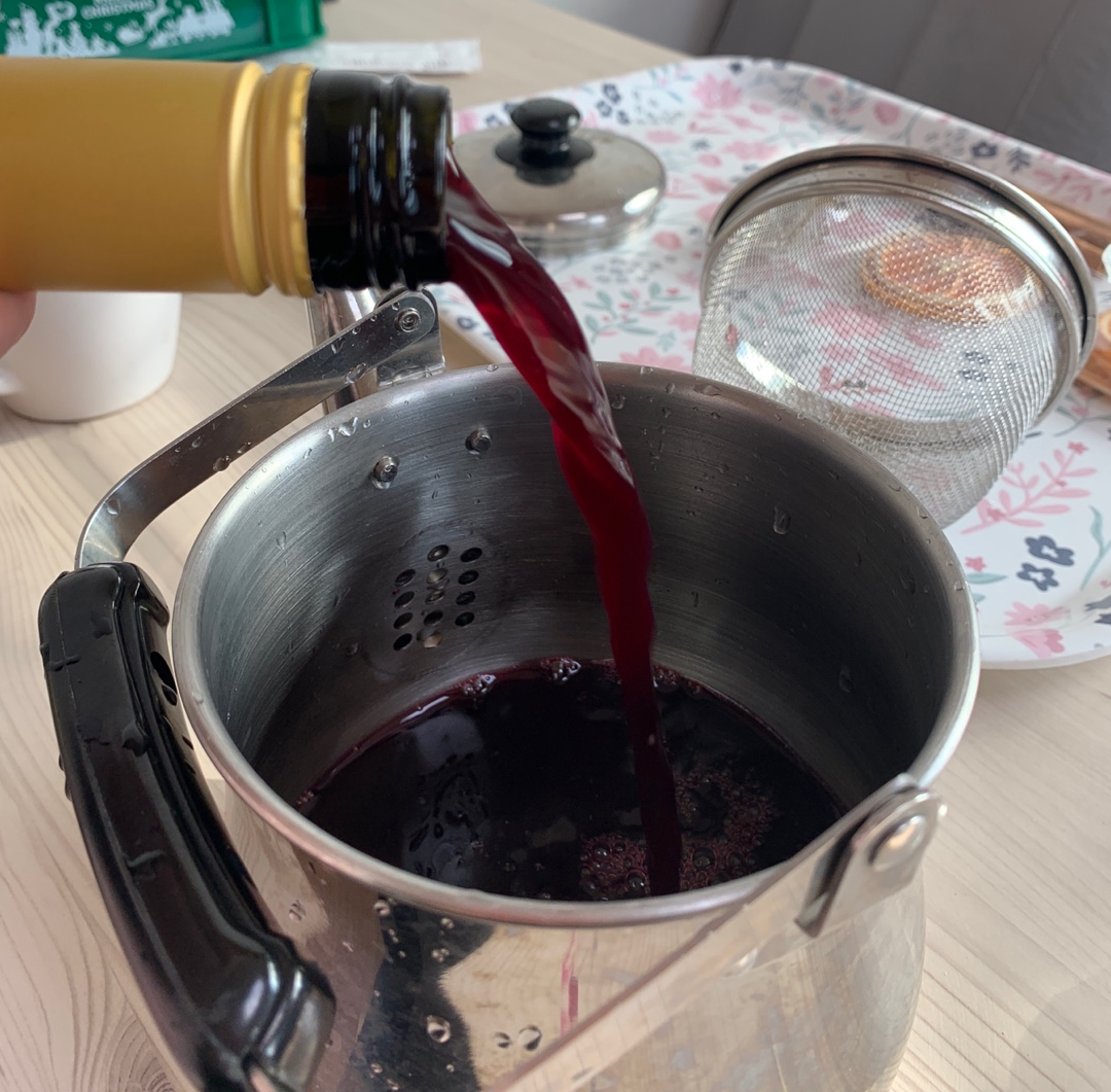 마치 못처럼 생긴 정향은 과일들에 콕콕 박아준다. 주전자에 와인을 붓고 키트에 있는 재료들을 넣어 준다. 푹 잠기게 넣어야겠지만 과일의 양이 너무 많은 것 같아 살짝만 잠기게 해서 끓였다.