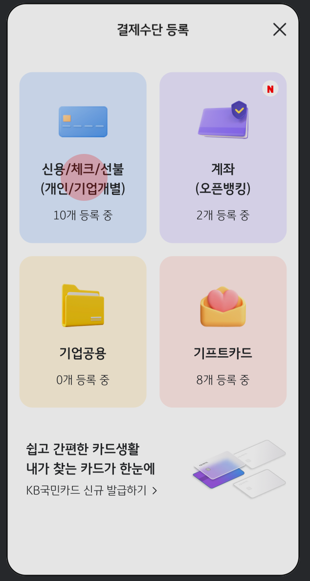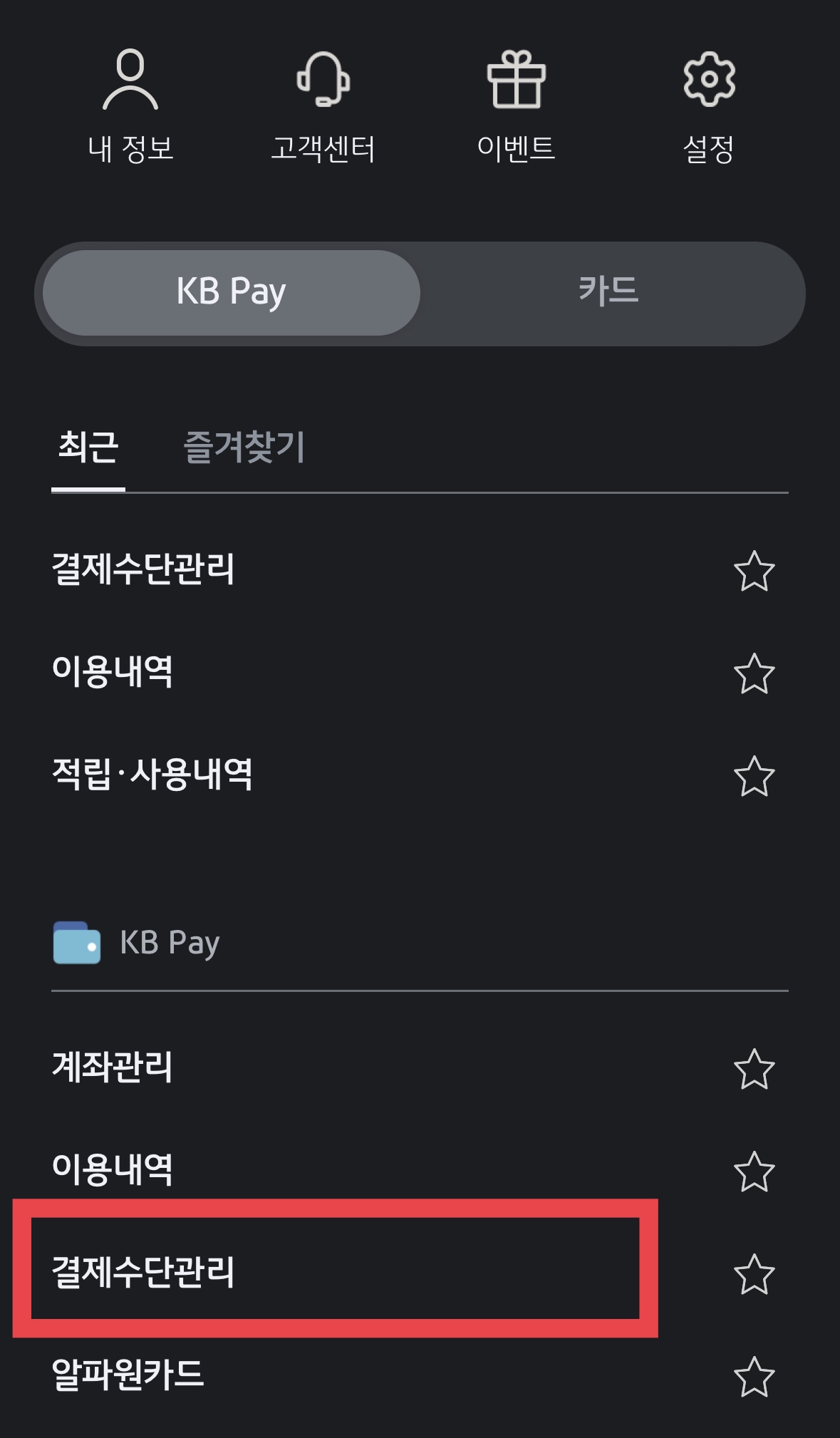 2. 메뉴 - KB Pay - 결제 수단관리 선택
