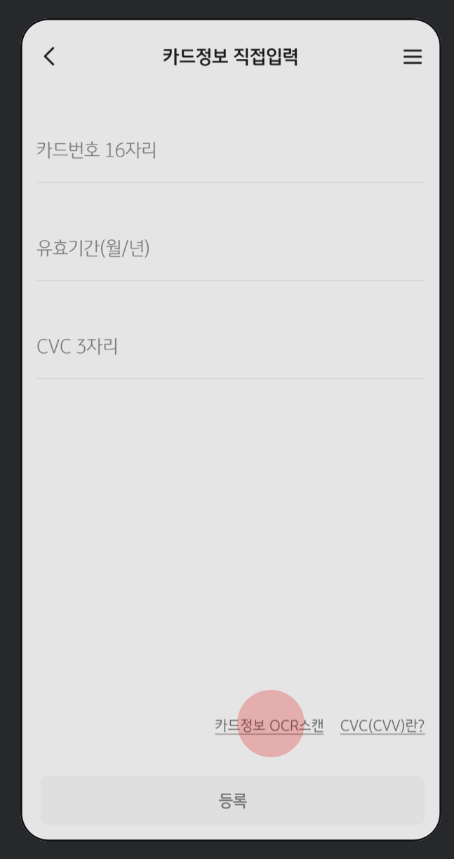 5. 카드를 촬영(OCR)하거나, 카드 정보를 직접입력하고 등록 버튼을 누른다.