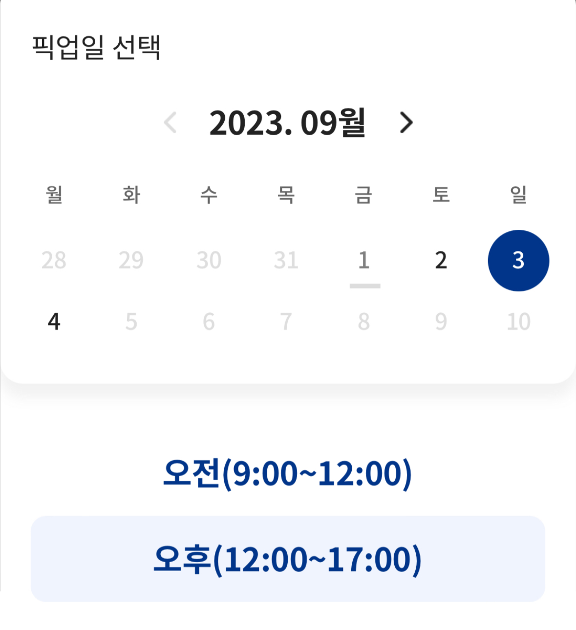원하는 픽업일과 오전/오후 시간을 선택한다.