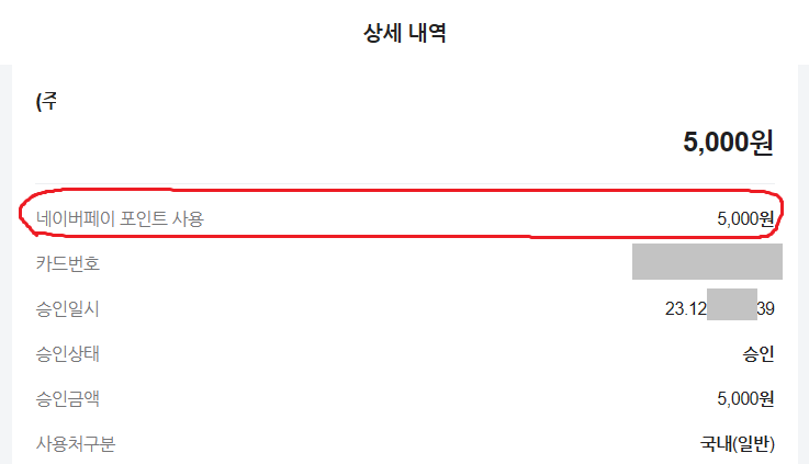 네이버포인트로만 5000원이 결제되었다.