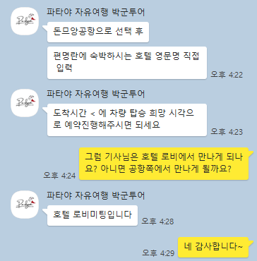 비행기에서 내려서 바로 탈 생각이 아니라서 어떻게 해야 하나 고민하다가 박군투어에 카톡으로 문의를 했다.