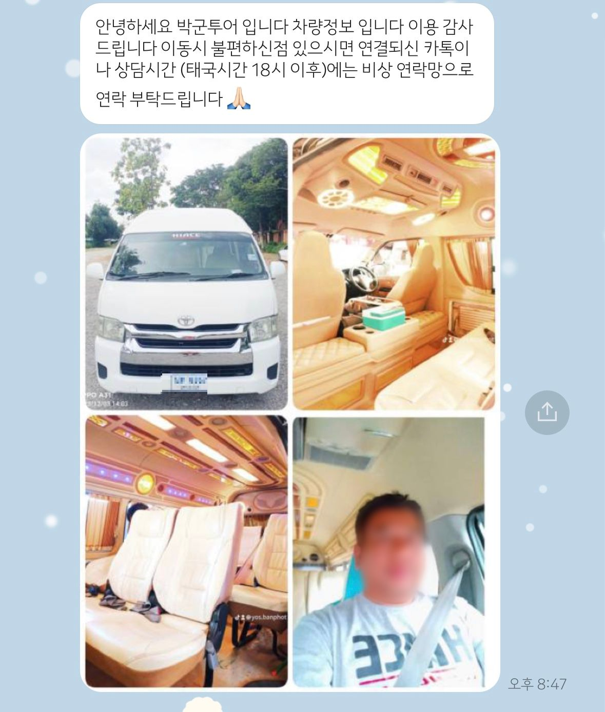 출발하기 전날 이렇게 차량 정보와 기사님 사진을 보내준다.
