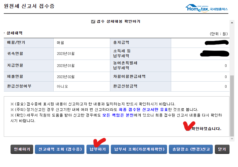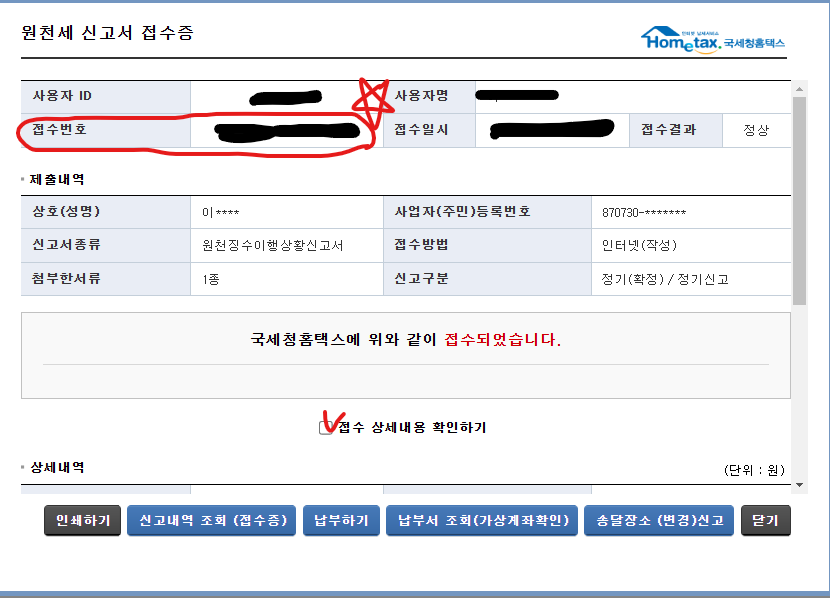 ● 원천세 신고서 접수증 화면이 나오는데, 이 화면의 접수번호를 메모해놓아야 한다.