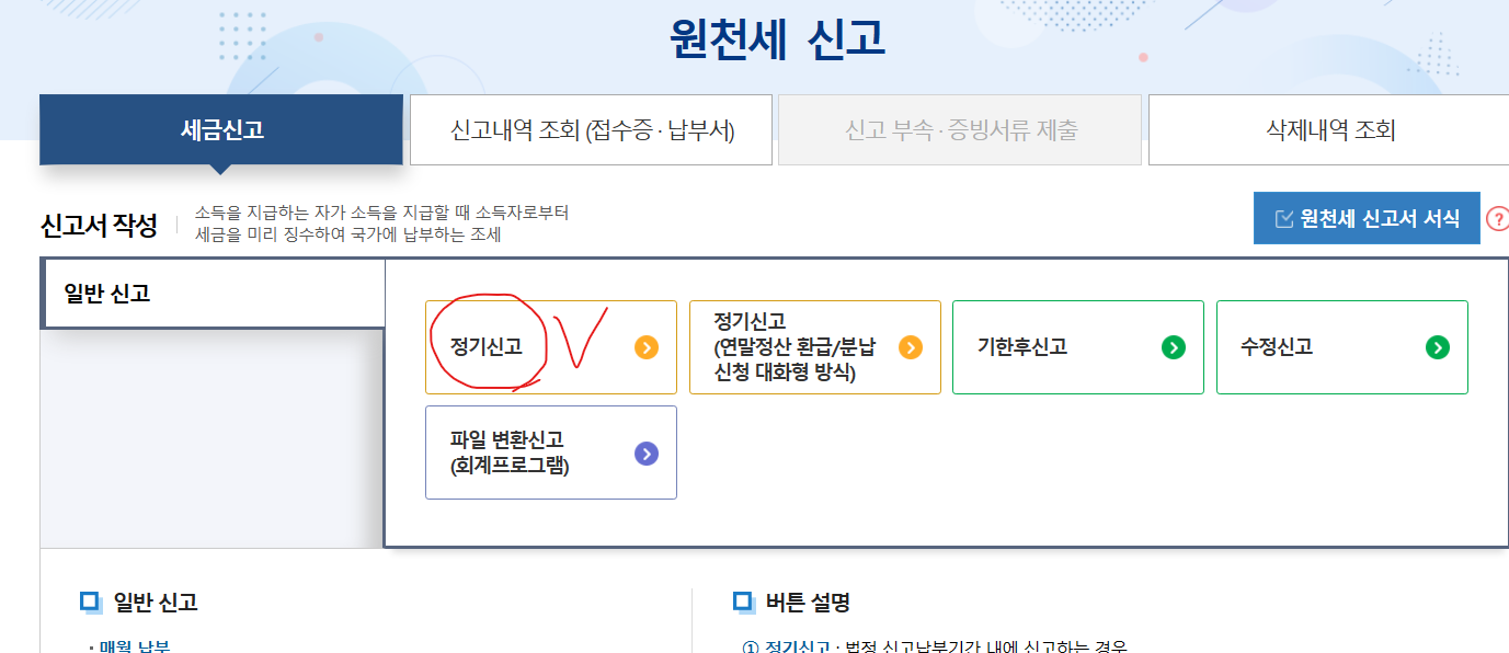 ● 상단 세금신고 - 원천세 - 일반신고 클릭한다.