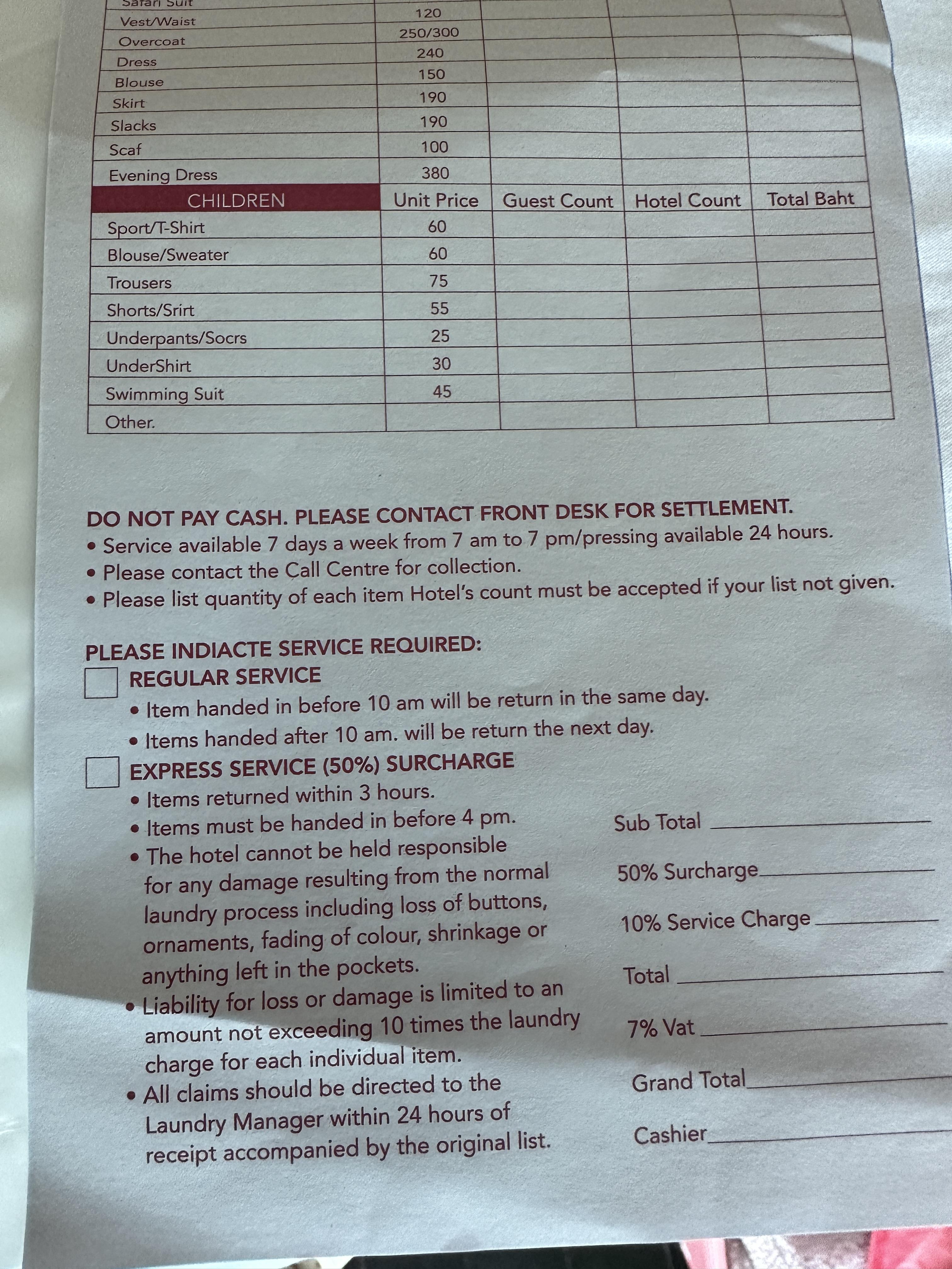참고로 유료 세탁시, 쓰여진 금액에 서비스차이10%와 부가세7%가 붙는다. (총 17.7%)