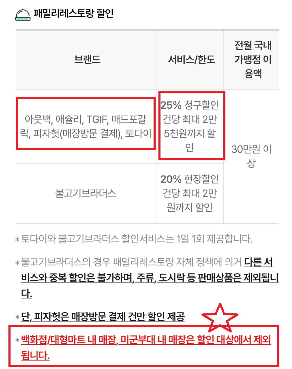 (토다이, 불고기브라더스는 1일 1회 제한이 있다.)