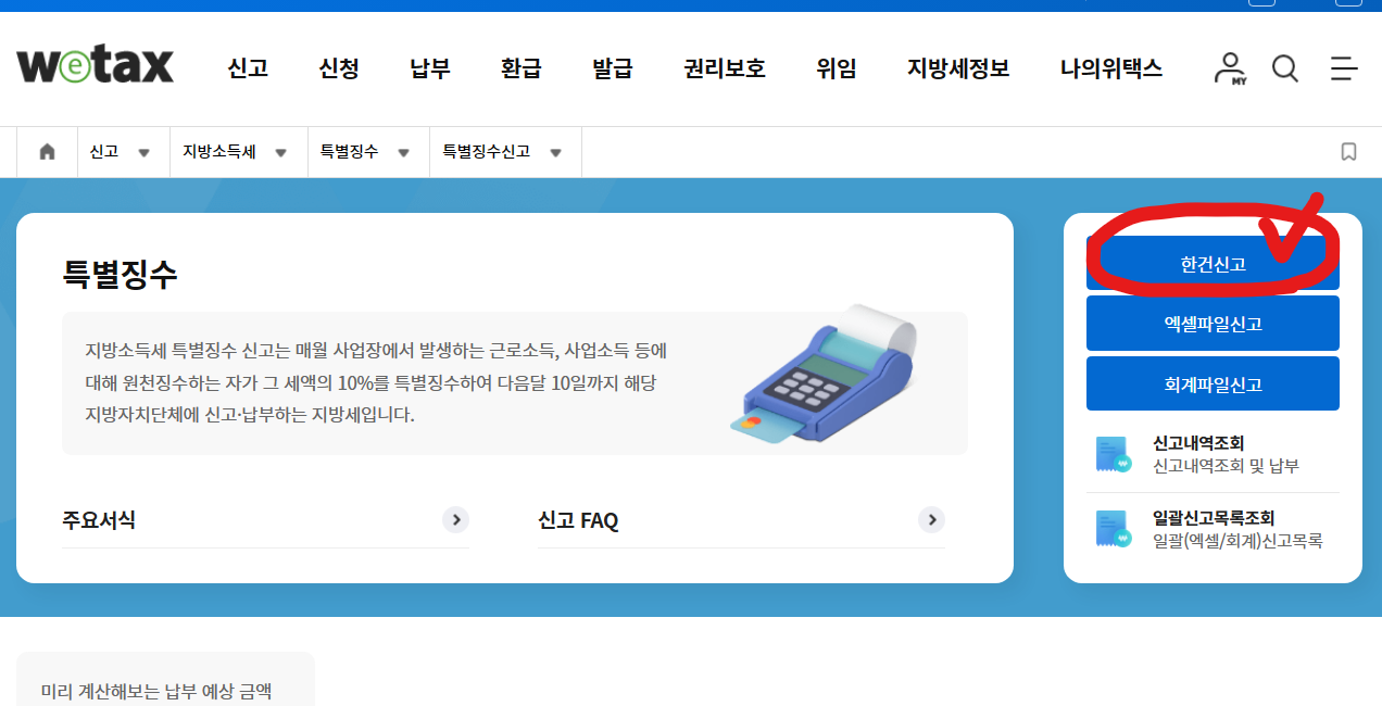 [신고] - [지방소득세] - [특별징수] - [특별징수 신고]를 클릭한다.