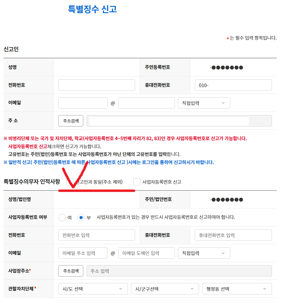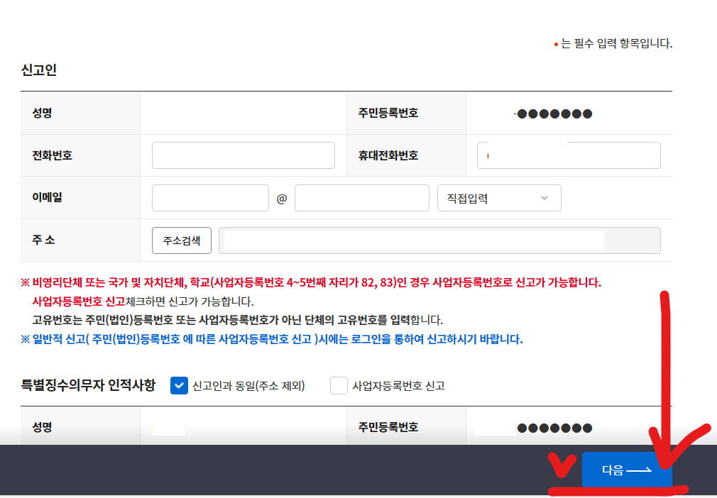 나는 사업자번호 없이, 개인이기에 신고인과 동일하게 체크했다.