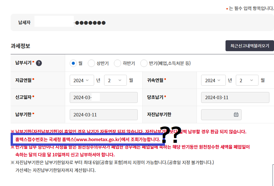 국세를 신고한 홈택스 접수번호를 입력하면 자동으로 입력되어서 편리했는데