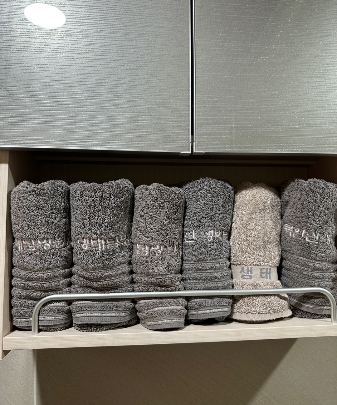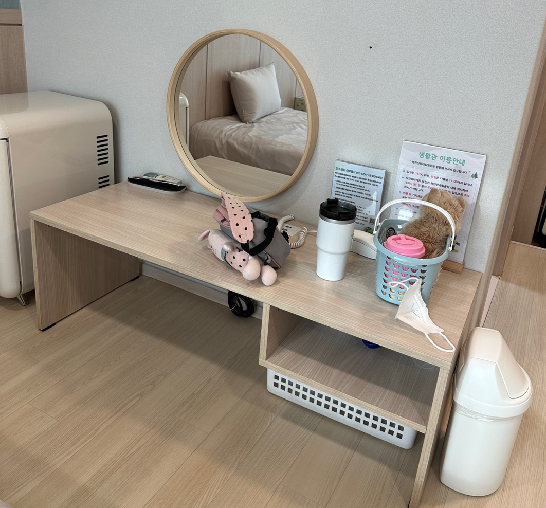 - 사용한 수건은 수건 바구니에 넣기 (화장대 아래에 있다.)