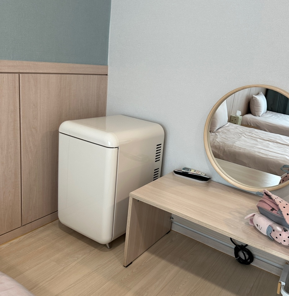 침대 옆에는 작은 화장대와 냉장고가 있다.