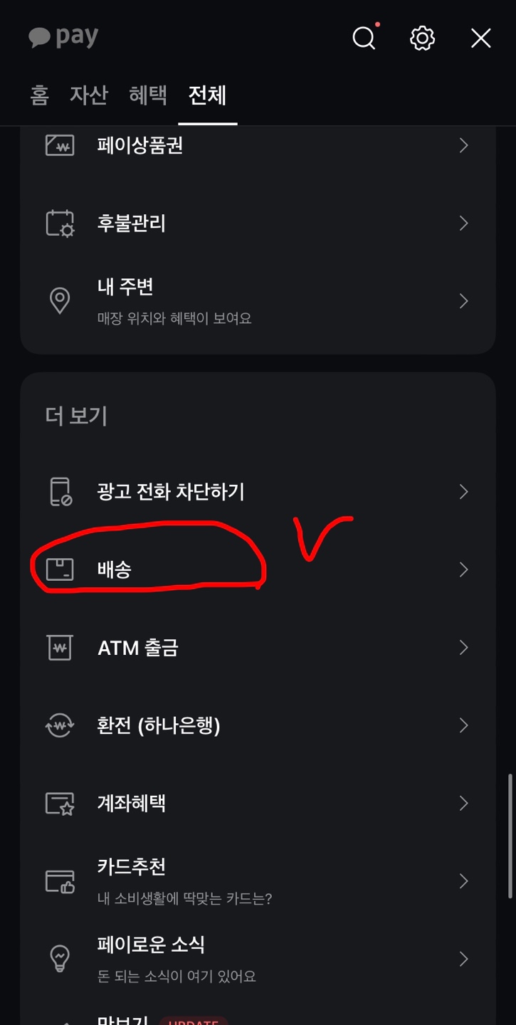 위에서 <전체> 탭을 누르고, 아래 긴 목록 중에서 <배송>을 찾는다.
