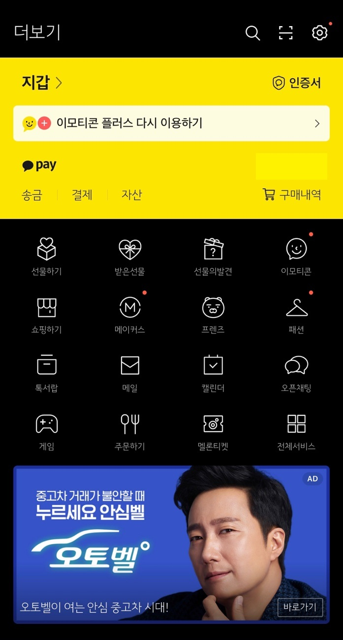 카톡 앱에서 아래 ... 버튼을 누르면 더 보기 화면이 나온다.