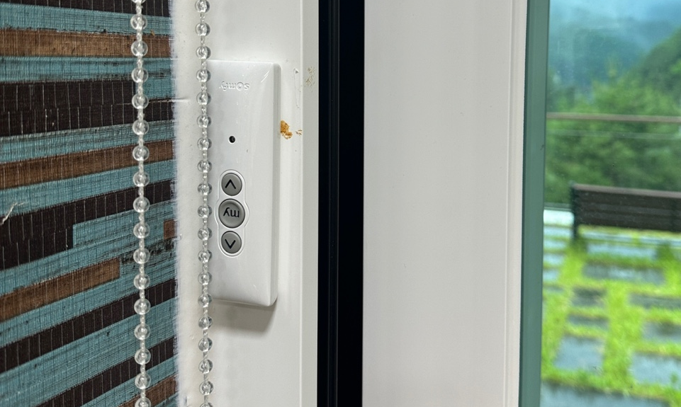 어닝은 거실 창문 왼쪽, 버튼을 누르면 전동으로 펴고 접을 수 있다.