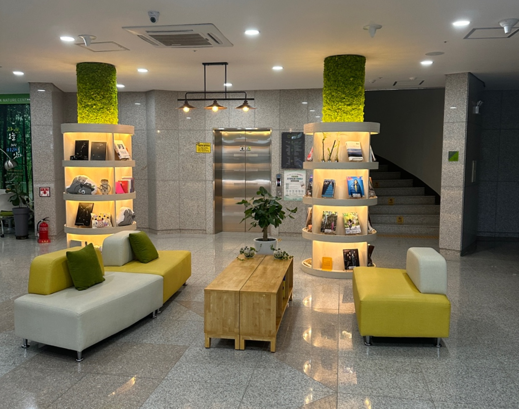 로비에는 의자에 앉아 책을 읽을 수 있는 공간이 있었다.