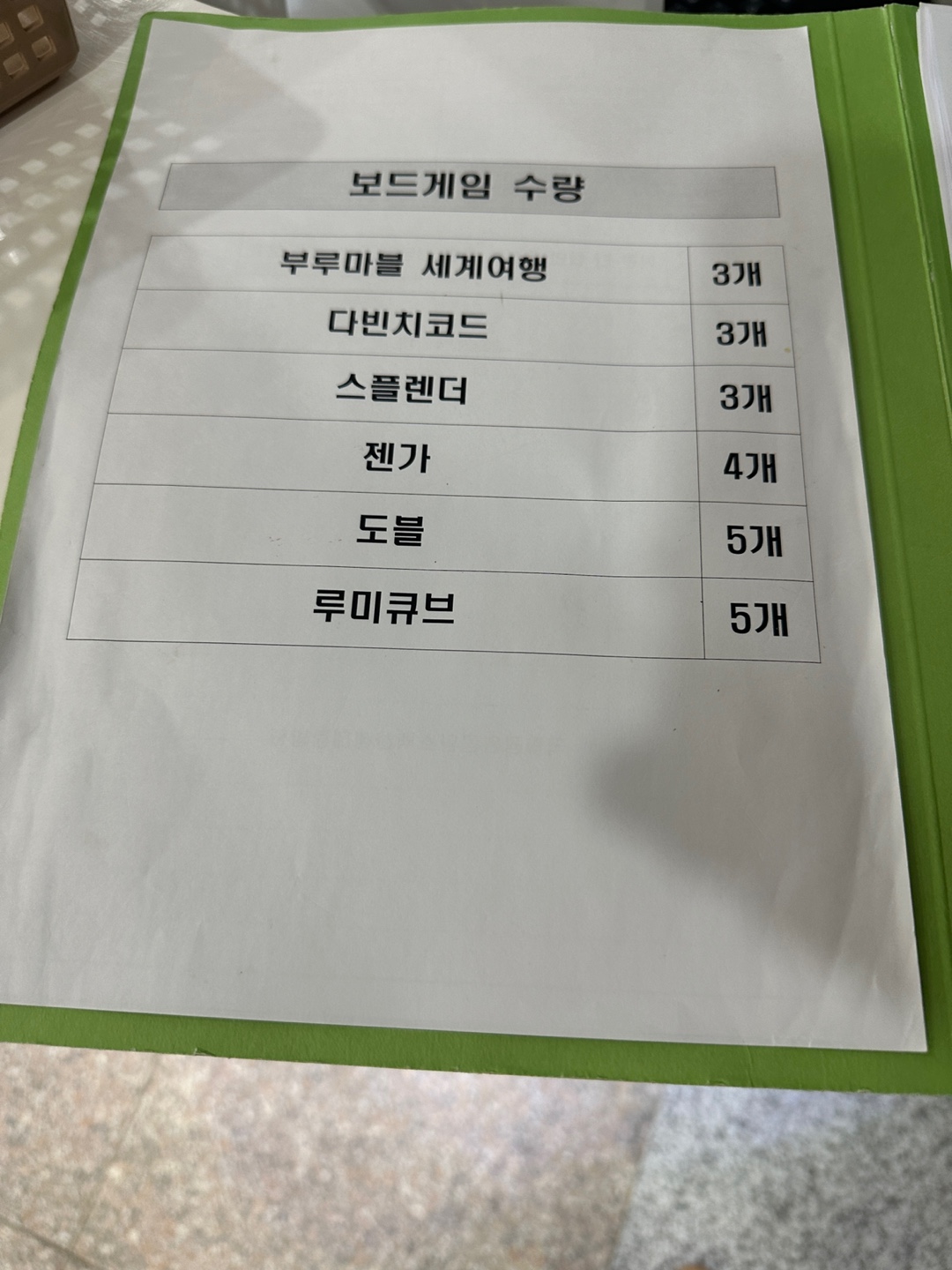 보드게임은 부루마불, 다빈치코드, 스플렌더, 젠가, 도블, 루미큐브가 있다.