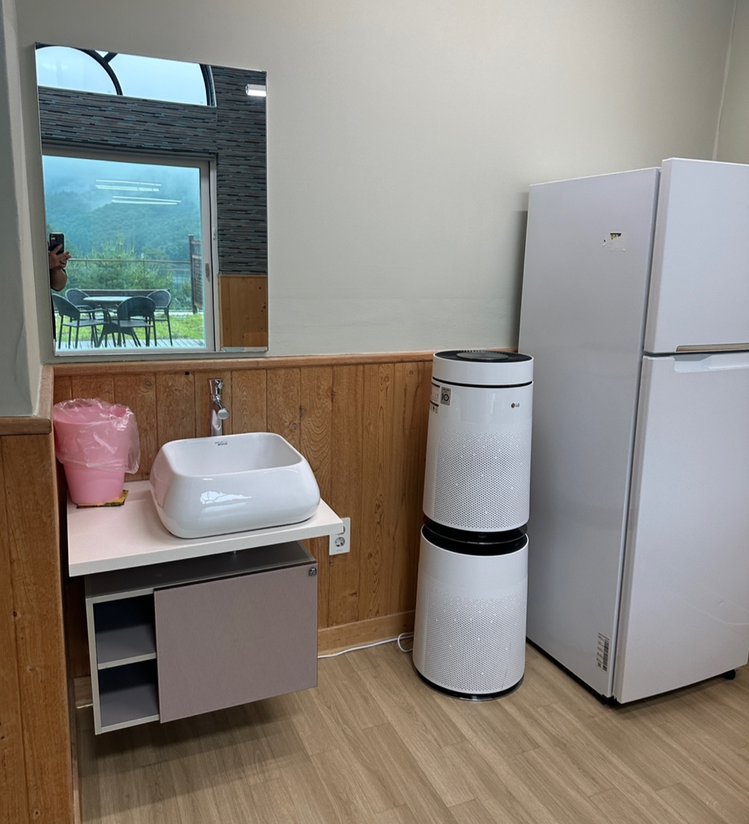 거실 한켠에는 큰 냉장고, 공기청정기, 그리고 손을 씻을 수있는 세면대가 있다.