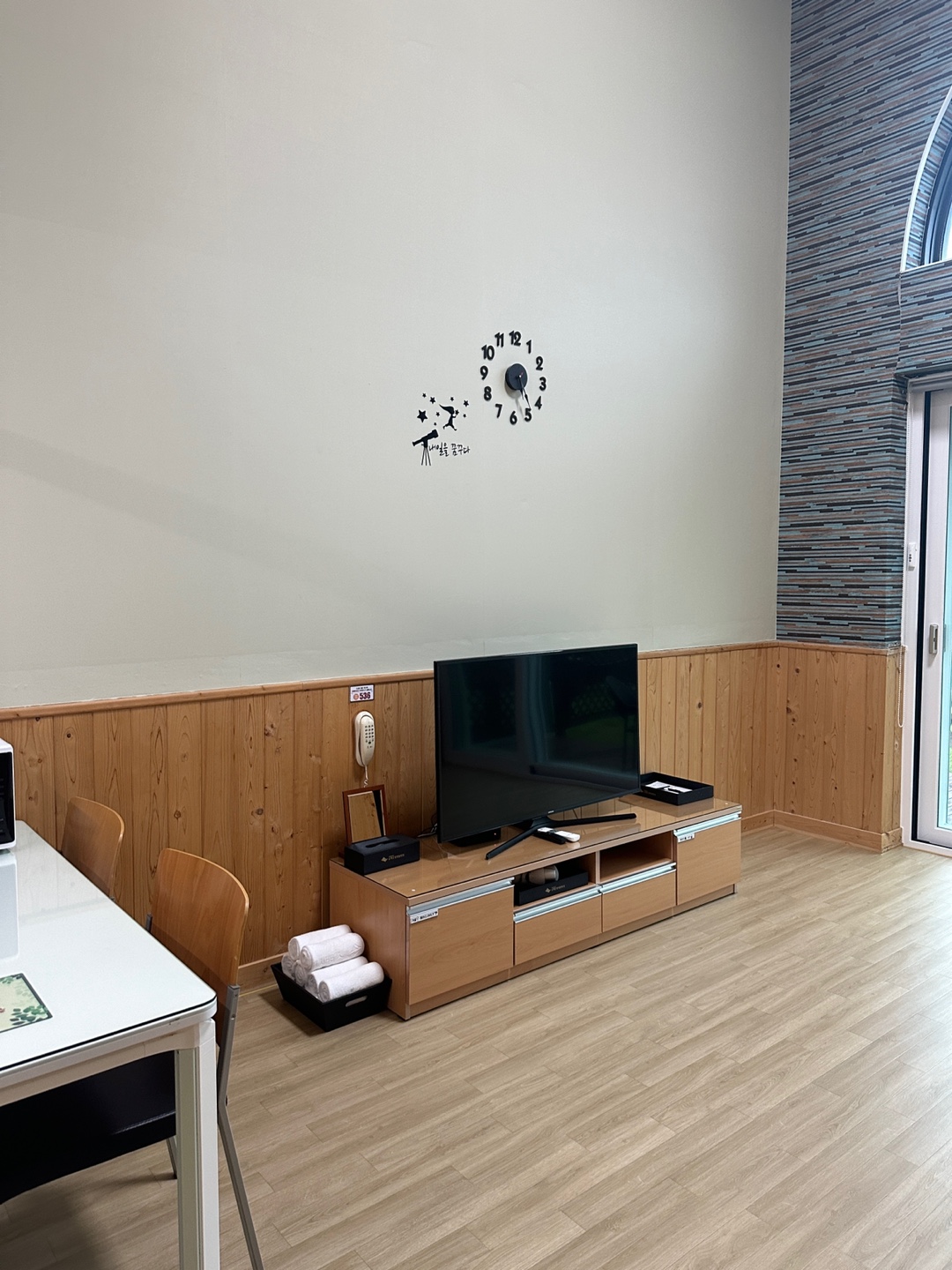 TV, 와이파이 공유기, 헤어드라이기, 수건 등이 거실장 쪽에 있다.