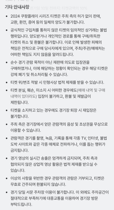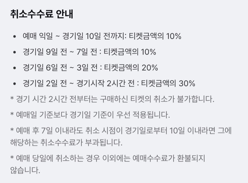 예매 다음날 ~ 경기일 7일 전 : 티켓금액의 10%