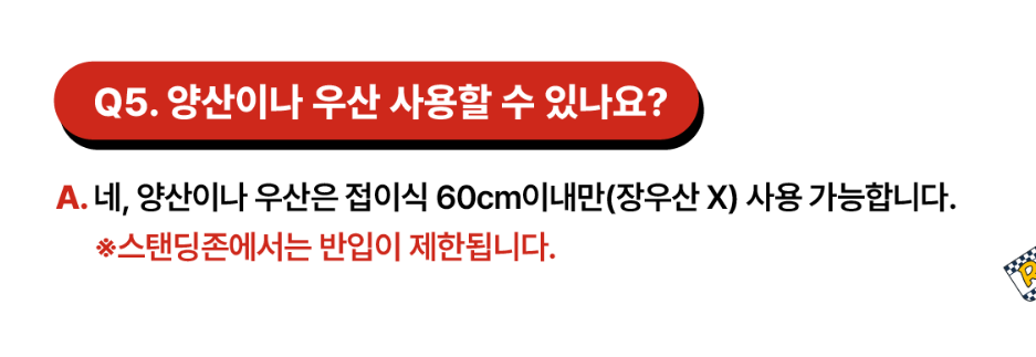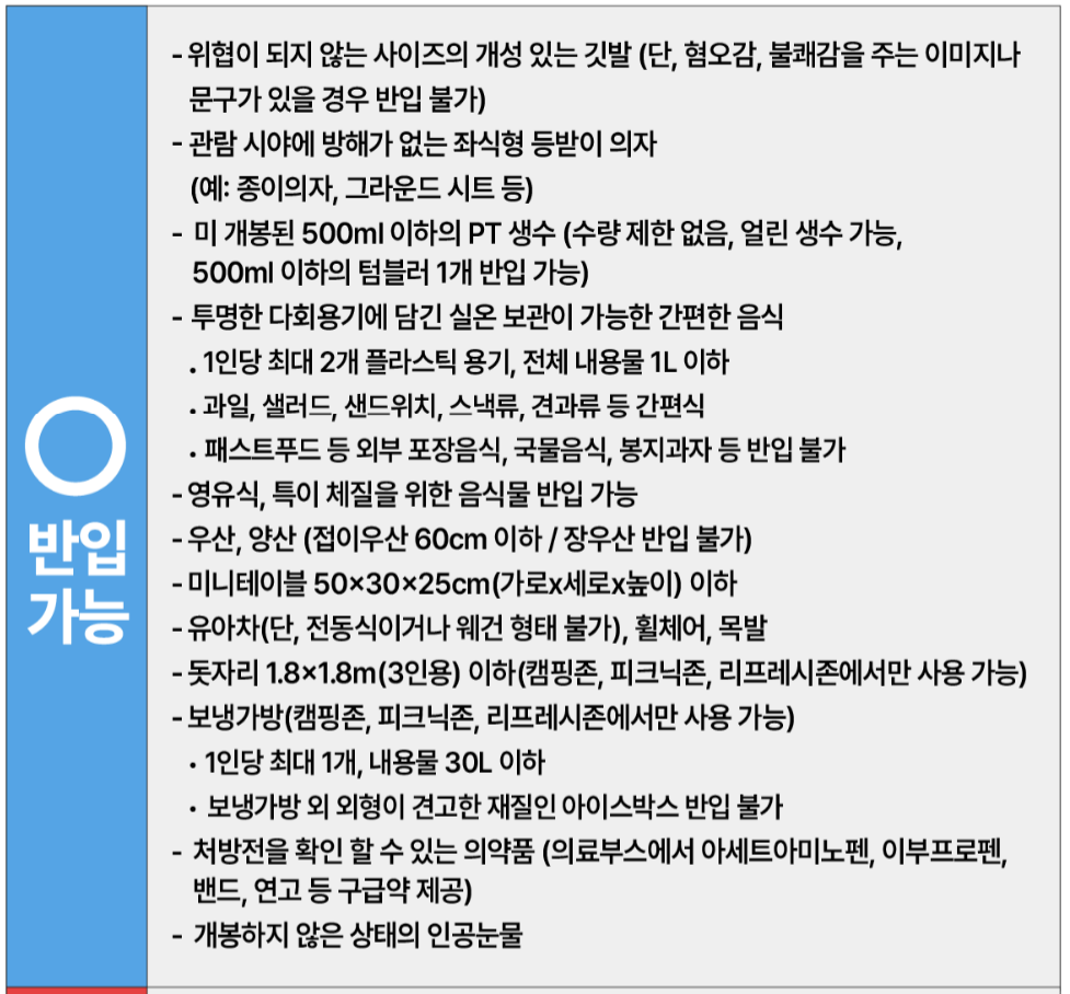 60cm 이내의 접이식 양산이나 우산 반입 가능하다.
