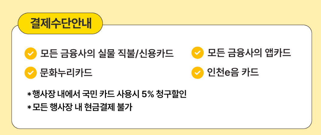 모든 체크카드, 신용카드, 앱카드, 문화누리카드, 인천e음 카드로 결제할 수 있다.