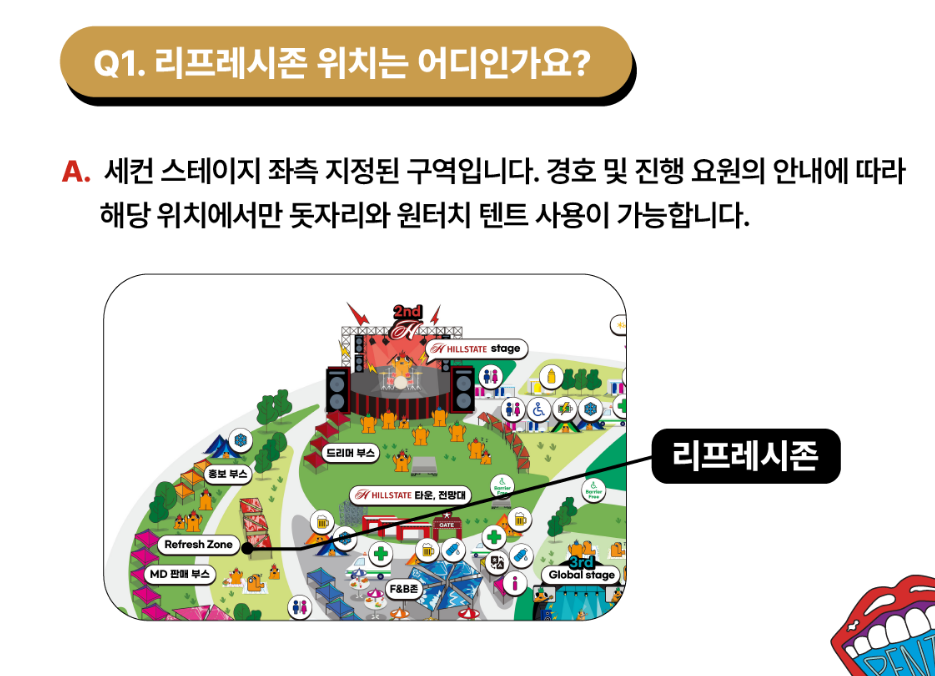 리프레시존은 서브스테이지 좌측에 지정된 공간으로, 돗자리와 원터치텐트를 사용할 수 있다.