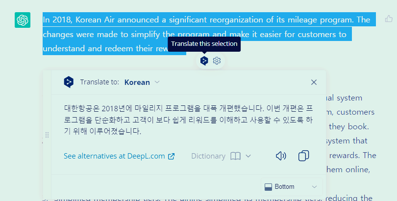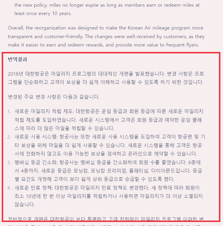AI가 영어로 답변을 하면, 그 답변 역시 자동으로 번역하여 표시해 준다.