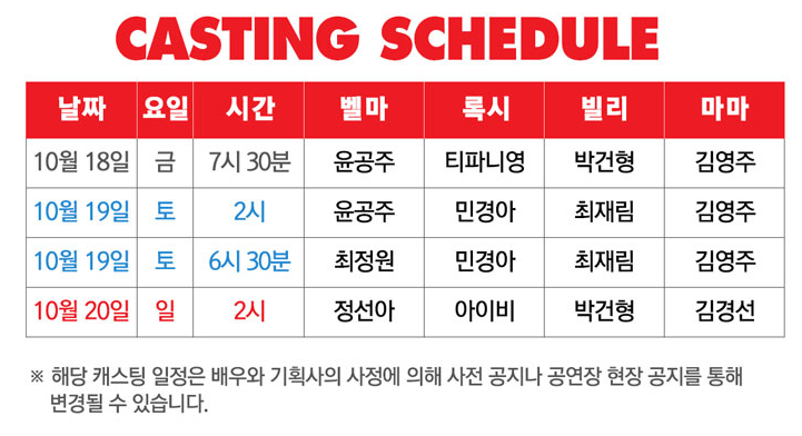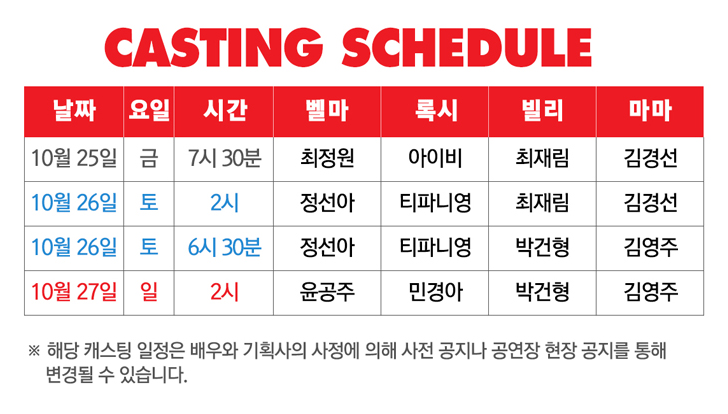 | 10월 25일 | 금 | 7:30 | 최정원 | 아이비 | 최재림 | 김경선 |