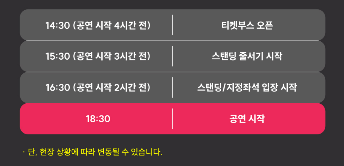 오후 2시 30분에 티켓부스 오픈(티켓 배송 이후 예매자와 글로벌 페이지 예매자 현장수령)