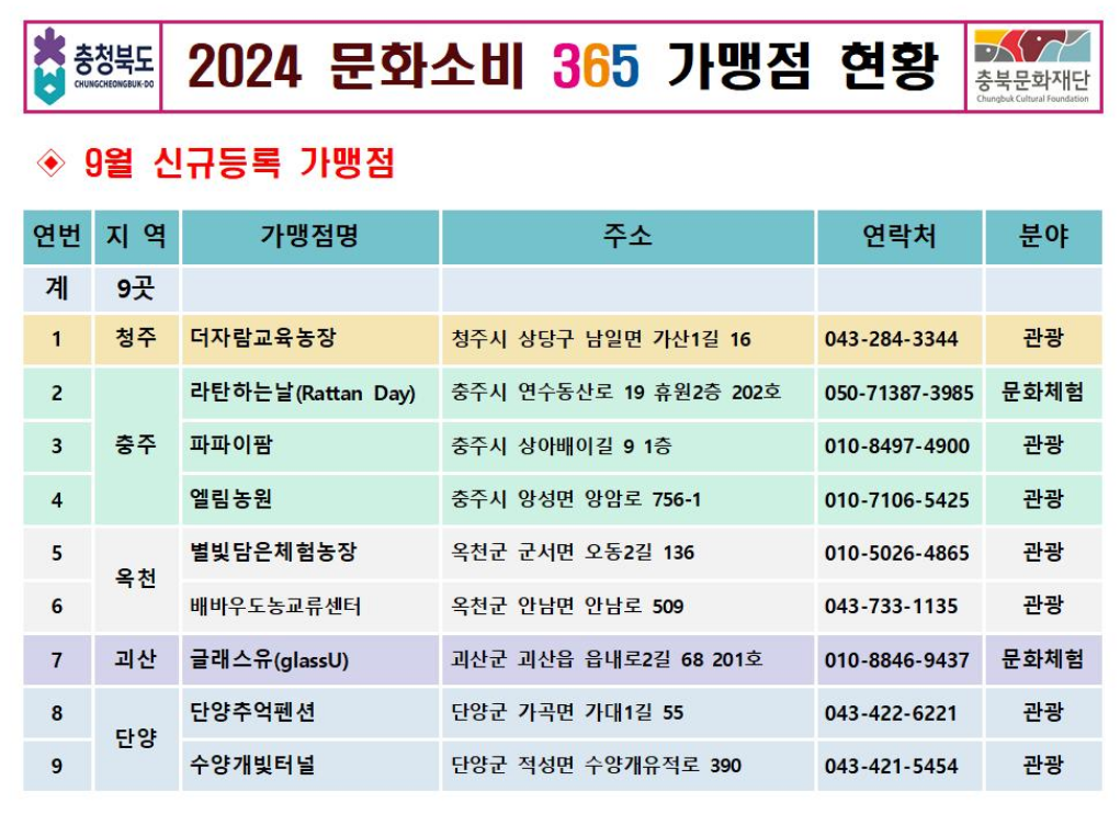 청주, 충주, 옥천, 괴산, 단양, 제천 등 여러 도시의 문화 분야 가맹점이 등록되어 있다.