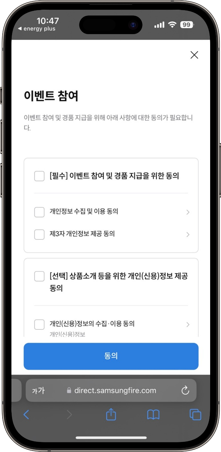 삼성화재는 이벤트 참여 동의에서 마케팅 동의를 해야 한다.