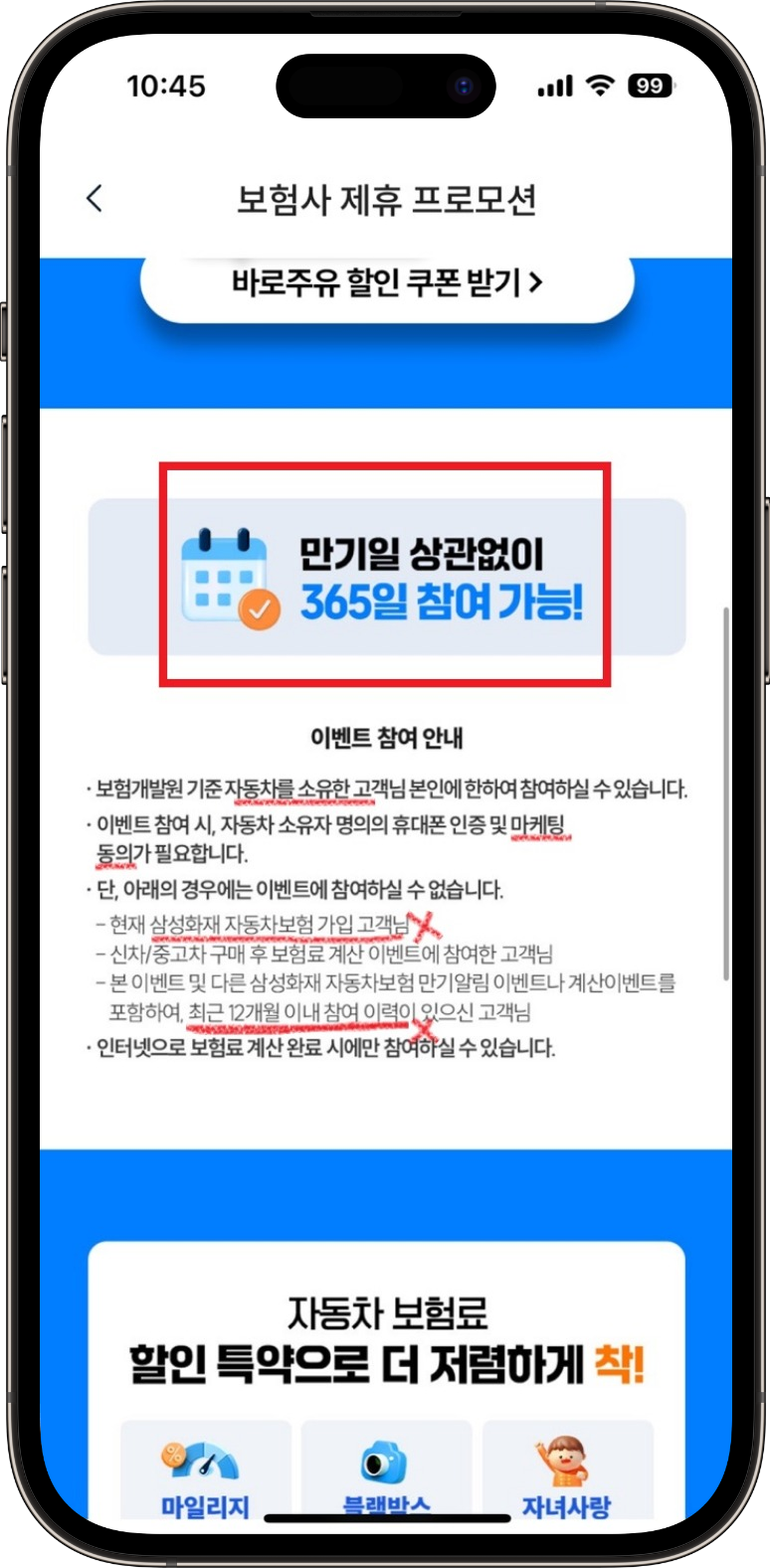 ✅삼성화재는 만기일 1개월 이내 조건은 없는 대신, 12개월 이내 이벤트 참여자는 제외된다.