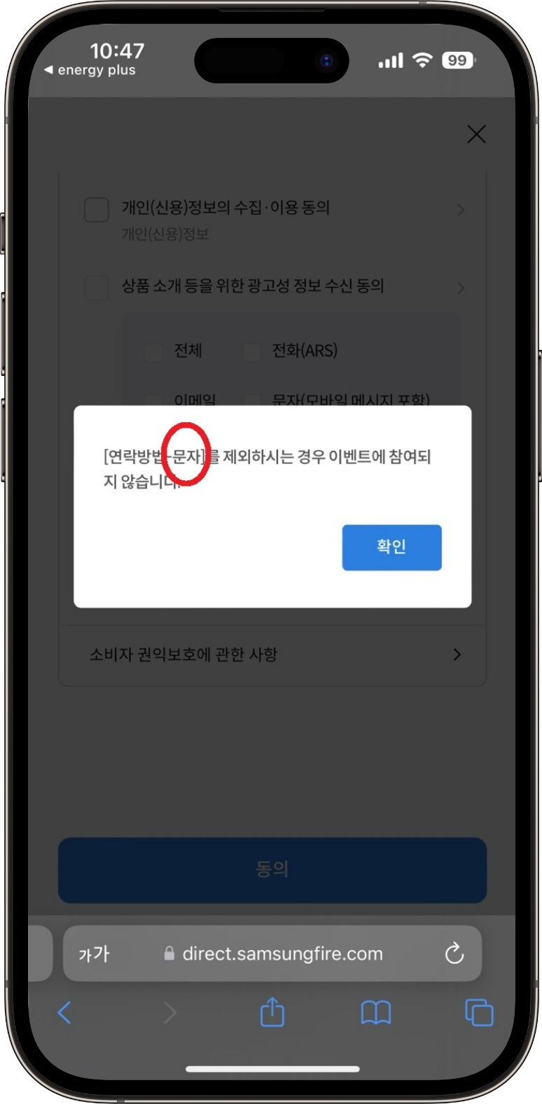 ✅선택 동의란에서 연락방법 중 [문자]에만 체크하면 된다.
