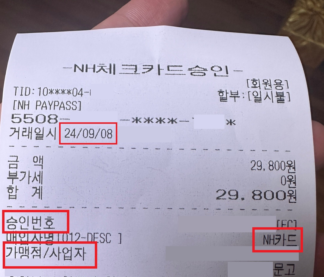 ✅ 영수증은 날짜, 가맹점번호, 승인번호가 모두 나오게 찍어야 한다.