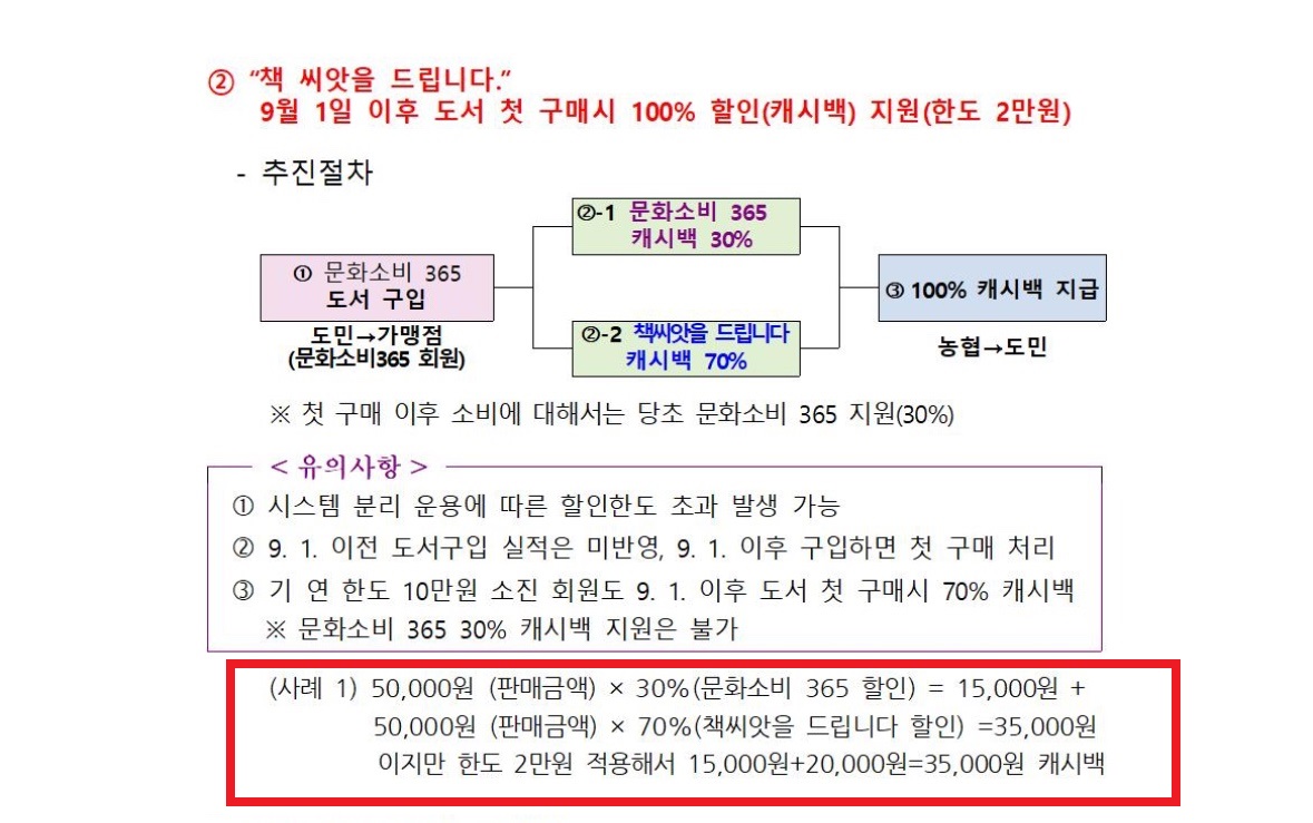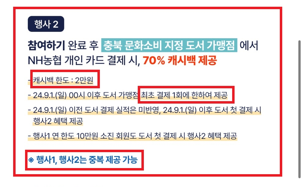 ✅ 도서가맹점에서 NH농협 개인카드로 결제시 70% 캐시백이 추가로 제공된다.