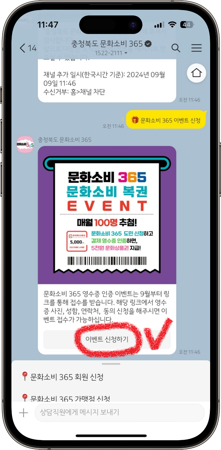 아래 메뉴에서 문화소비 365 이벤트 신청을 클릭