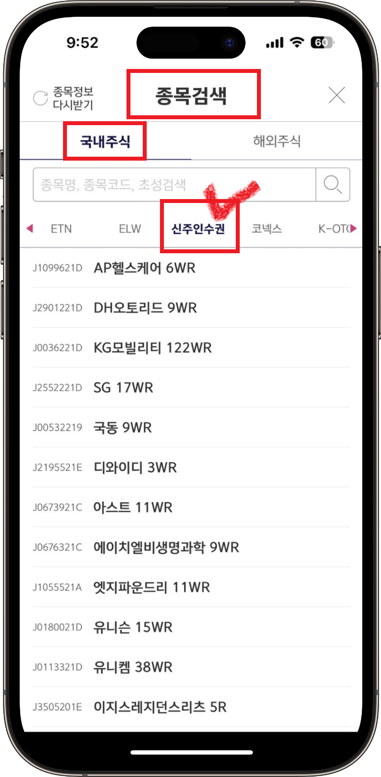 [주문] - [키움주문] - [돋보기(종목검색)] - [신주인수권]